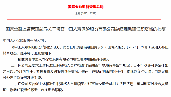 7月31日金融一线消息,据国家金融监督管理总局批复,核准侯晋中国人寿保险股份有限公司总经理助理的任职资格。